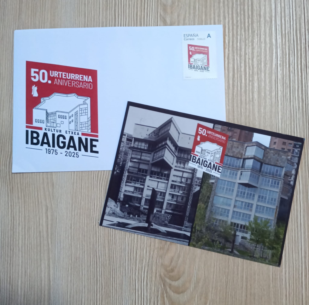 BASAURI: : sobre, postal, sello y matasello conmemorativos del 50 aniversario del Ibaigane Kultur Etxea.