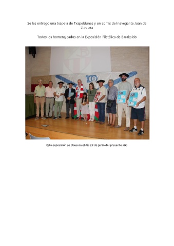 Se les entrego una txapela de Txapeldunes y un comís del navegante Juan de Zubileta Todos los homenajeados en la Exposición Filatélica de Barakaldo Esta exposición se clausura el día 29 de junio del presente año