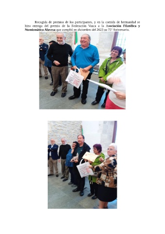 Recogida de premios de los participantes, y en la comida de hermandad se hizo entrega del premio de la Federación Vasca a la Asociación Filatélica y Numismática Alavesa que cumplió en diciembre del 2023 su 75º Aniversario.