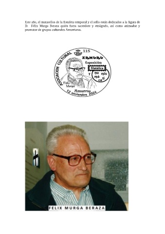Este año, el matasellos de la Estafeta temporal y el sello están dedicados a la figura de D. Félix Murga Beraza quién fuera sacerdote y etnógrafo, así como animador y promotor de grupos culturales Amurriaras.