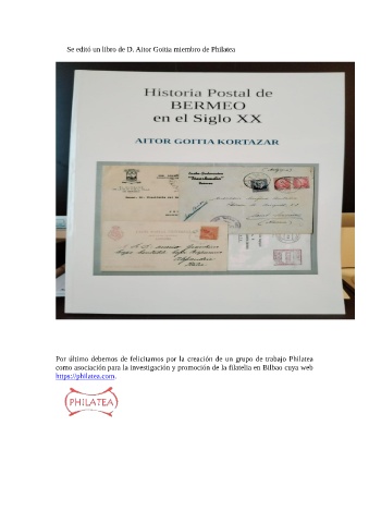 Se editó un libro de D. Aitor Goitia miembro de Philatea Por último debemos de felicitarnos por la creación de un grupo de trabajo Philatea como asociación para la investigación y promoción de la filatelia en Bilbao cuya web https://philatea.com.
