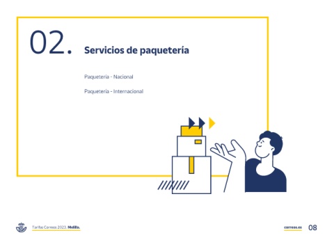 02 . Servicios de paquetería Paquetería - Nacional Paquetería - Internacional Tarifas Correos 2023 . Melilla. correos.es 08
